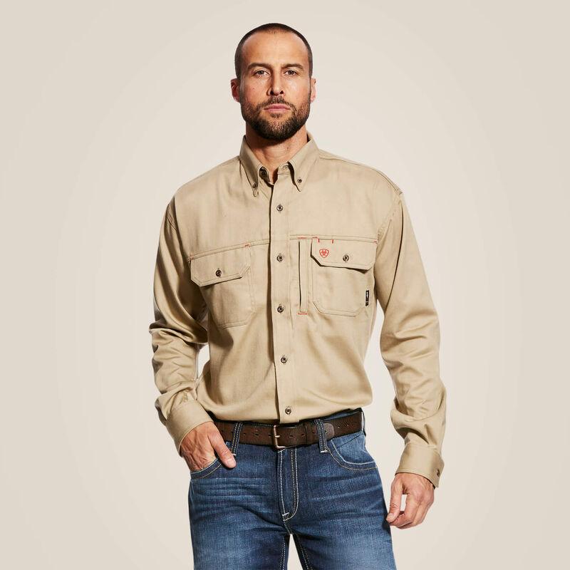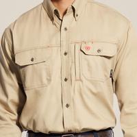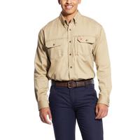 Men's Button Down FR Work Shirt - Mesh Vents to Keep You Cool & Dry - Strategically placed mesh vents add extra comfort to this hard-working shirt. It has the same good looks and great fit as Ariat® Western performance shirts, plus flame-resistance ideal for hazardous work environments. Color: Khaki