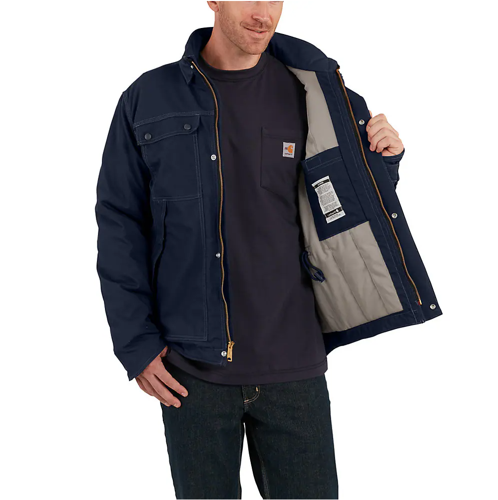 Designed with insights from the Carhartt Crew, this men's coat features our top tech and safety features. - Carhartt designed this men's coat with all of the safety and technical features the toughest jobs require. Flame-resistant duck repels water, while stretch panels give you full freedom of movement. Warm insulation keeps you comfortable in frigid weather.