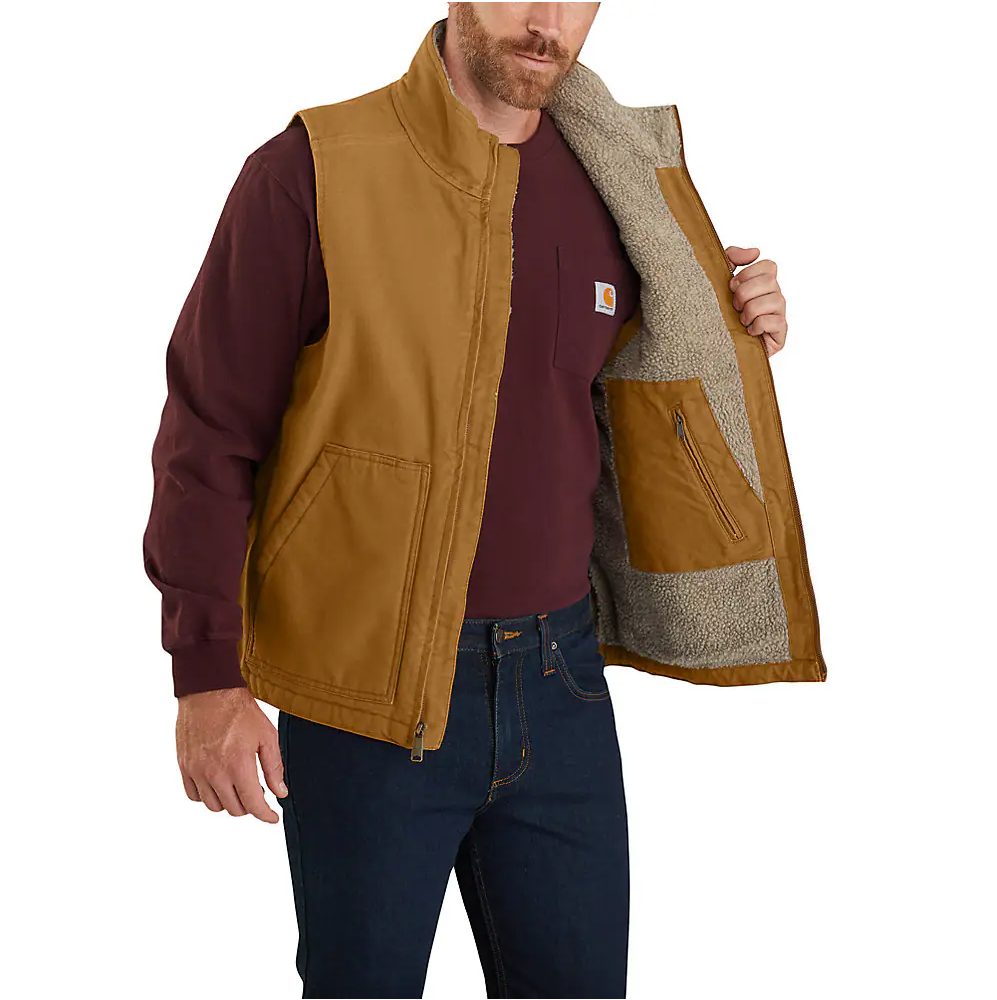 On a cool day, layer up and head out into the field in this vest. Made with our rugged cotton duck, it's sherpa-lined on the inside for extra warmth and comfort. A zip pocket on the chest and two inside pockets provide storage for the tools of your trade.