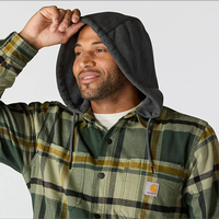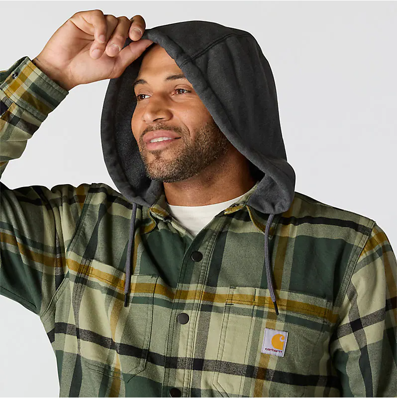 Stay warm while you work. This men's shirt jac is built for cold weather with a soft fleece lining and an attached hood. Stretch flannel and a relaxed fit allow you to lift boxes and swing a hammer with ease.