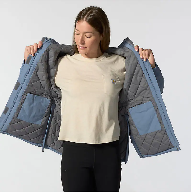 Carhartt durability meets all-weather coverage and insulation in this women's waterproof insulated jacket. A combination of a Storm Defender® waterproof, breathable protection and an insulated, wind-resistant build seals out cold, wet weather. Synthetic insulation throughout seals in heat without bulk. A relaxed fit includes a little extra room to move.