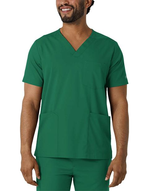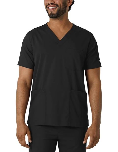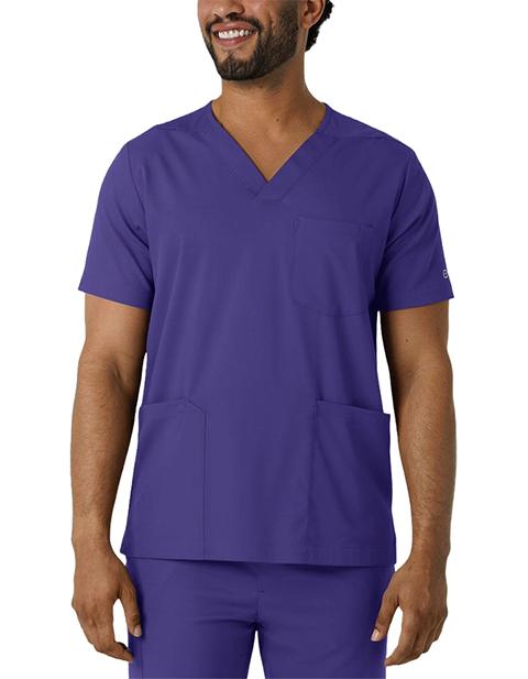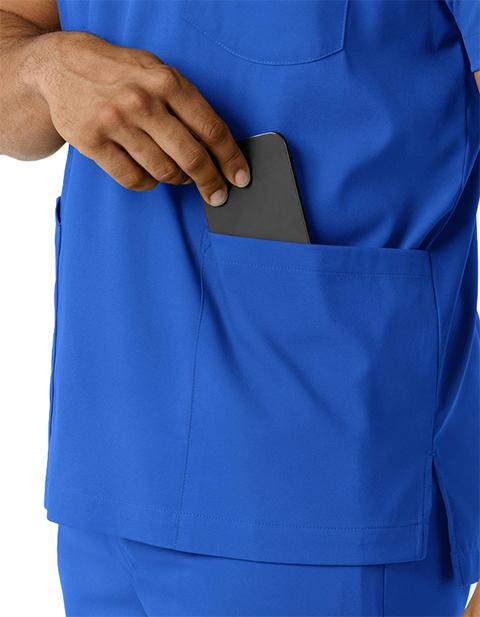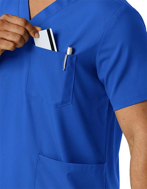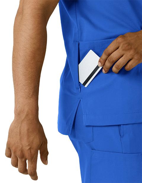 When your skills team up with functional workwear, there's no stopping how well you care for your patients. This men's scrub top gives you comfort, style and utility all in one versatile, easy-to-wear piece. It's made with a stretchy, soft material that won't restrict your movement as you make your way through busy shifts and long clinic days. You'll always have what you need nearby thanks to two top-loading pockets, one of which includes a pen slot to keep one of your most-used essentials right where you need it. One back card pocket with a zipper closure holds small items you'd prefer to keep close. Side hem vents open up the silhouette so your scrub top won't bunch up or constrict as you lean, twist and pivot from task to task. The classic V-neck design looks crisp and professional, giving you a polished look every time you suit up. The hem is slightly longer in the back for a modern fit.